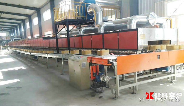 輥道窯的燃燒室在輥子的下方,用壓縮空氣霧化重油、柴油、煤油等燃料進行燃燒。也有用煤氣發(fā)生爐所產煤氣進行燃燒的,比較大型的陶瓷廠大都采用雙段冷煤氣站,使用冷靜煤氣進行燃燒,產生高溫。燃燒室與輥道之間,有耐火材料隔離,火焰不直接接觸被燒制的產品。相對來說,煤氣發(fā)生爐配套輥道窯燃燒比重油、柴油等成本低,比直接燃煤效率高環(huán)保達標。使用重油為燃料時,為防止煙氣污染制品,要采取隔焰或半隔焰形式。電熱時,為保護發(fā)熱體或使溫度更均勻,也需將發(fā)熱體和制品隔開。